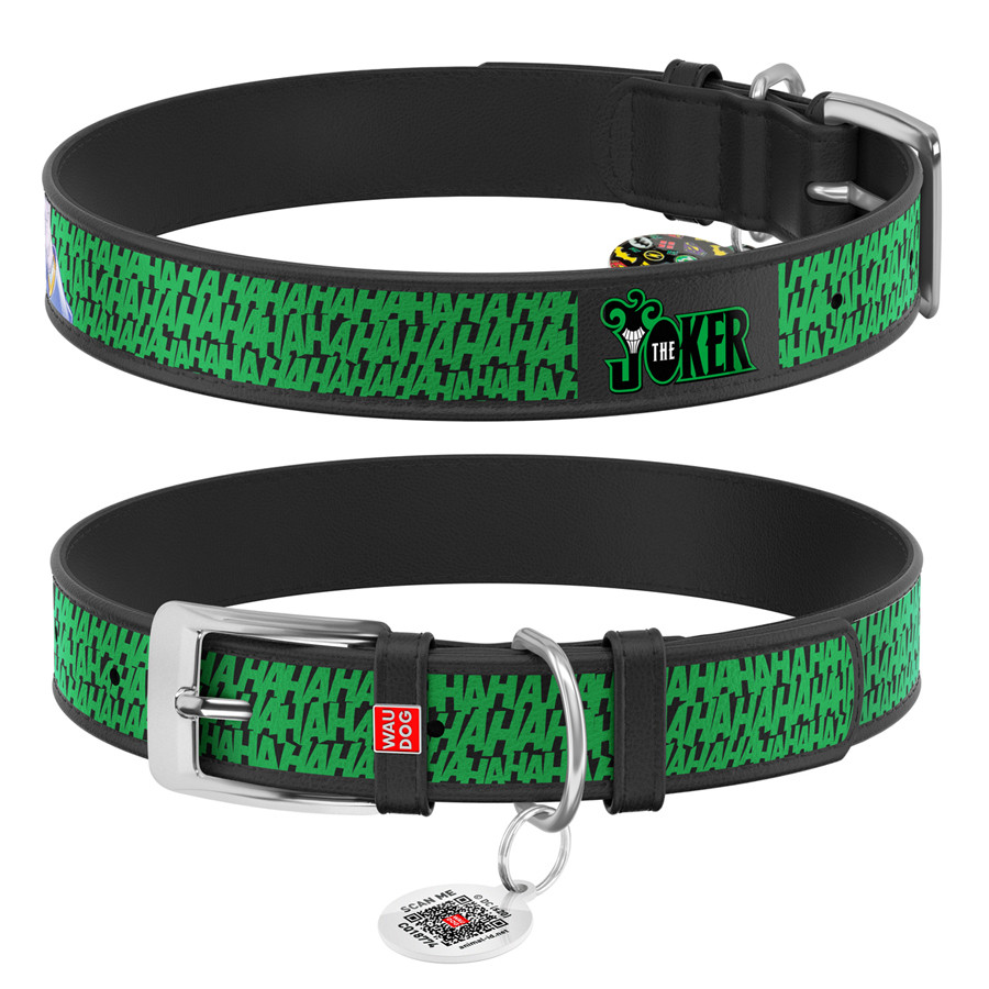 Нашийник для собак шкіряний WAUDOG Design з QR паспортом, малюнок "Джокер", Ш 35 мм, Д 46-59 см, чорний