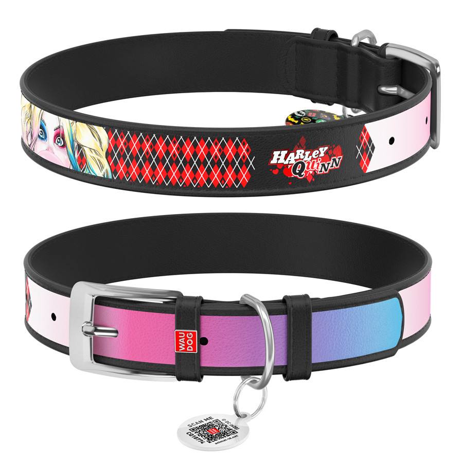-15%Нашийник для собак шкіряний WAUDOG Design з QR паспортом, малюнок "Харлі Квінн", Ш 25 мм, Д 38-49 см, чорний